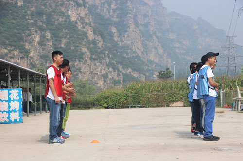 我們先進行了拓展前的熱身活動,兩個簡單的小游戲消除了大家彼此間的陌生感,活躍了氣氛。然后,大家被教練分成兩組,并被要求在半小時內(nèi)選出隊長,取隊名,定口號,繪制隊旗,選定隊歌并擺出團隊造型。大家都集思廣益,分工合作,各顯其能。