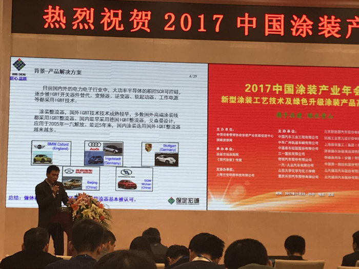 在年會上,我司總經(jīng)理袁世鋒先生以“涂裝電泳安全及節(jié)能的解決新方案——IGBT模塊電源”為題進行了演講,重點介紹了IGBT模塊電源的發(fā)展,原理及應(yīng)用。現(xiàn)場展示了保定宏誠為汽車涂裝行業(yè)服務(wù)過的項目成果。