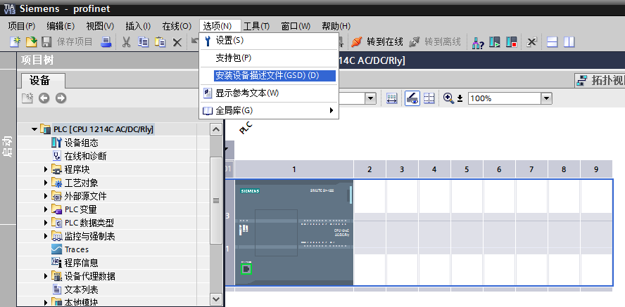 將GSDML文件拷貝入計(jì)算機(jī)硬盤(pán)。啟動(dòng)“TIA Portal V13 ”軟件,打開(kāi)任意工程,在軟件菜單欄點(diǎn)擊“選項(xiàng)”按鈕,在彈出的子菜單中點(diǎn)擊“安裝設(shè)備描述文件”。